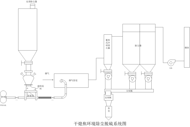 3、技术特点 3.1用于低硫烟气的治理:可满足超低排放要求,脱硫效率高,出口SO₂浓度可达到趋零排放的指标;在干熄焦环境除尘烟气脱硫中,烟气二氧化硫浓度在40~700mg/m³之间,尤其适合; 3.2温度窗口宽泛,使用40—300℃的烟气处理,脱硫效率高; 3.3工艺流程短、运行维护简单:直接将超细粉喷射到烟道内,在烟气流功过程中充成吸收反应 3.4系统阻力不变: 3.5系统能耗低,只增加气流输送动力消耗: 3.6副产物处理简单:脱硫后的副产物为饱和态废脱硫剂,主要成分CaSO₄、Ca(OH)2、CaCO3,呈固体状态,随焦粉进行外卖。 3.7该技术工艺流程简单,设备占地面积小,人工劳动强度低,脱硫剂成本较低,固废为一般固废,容易处理,因此,在烟气含SO₂浓度较低的行业中,对烟气进行脱硫处理具有一定的优势。 |